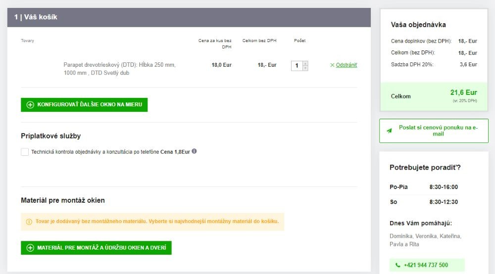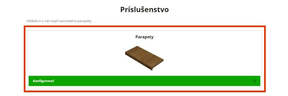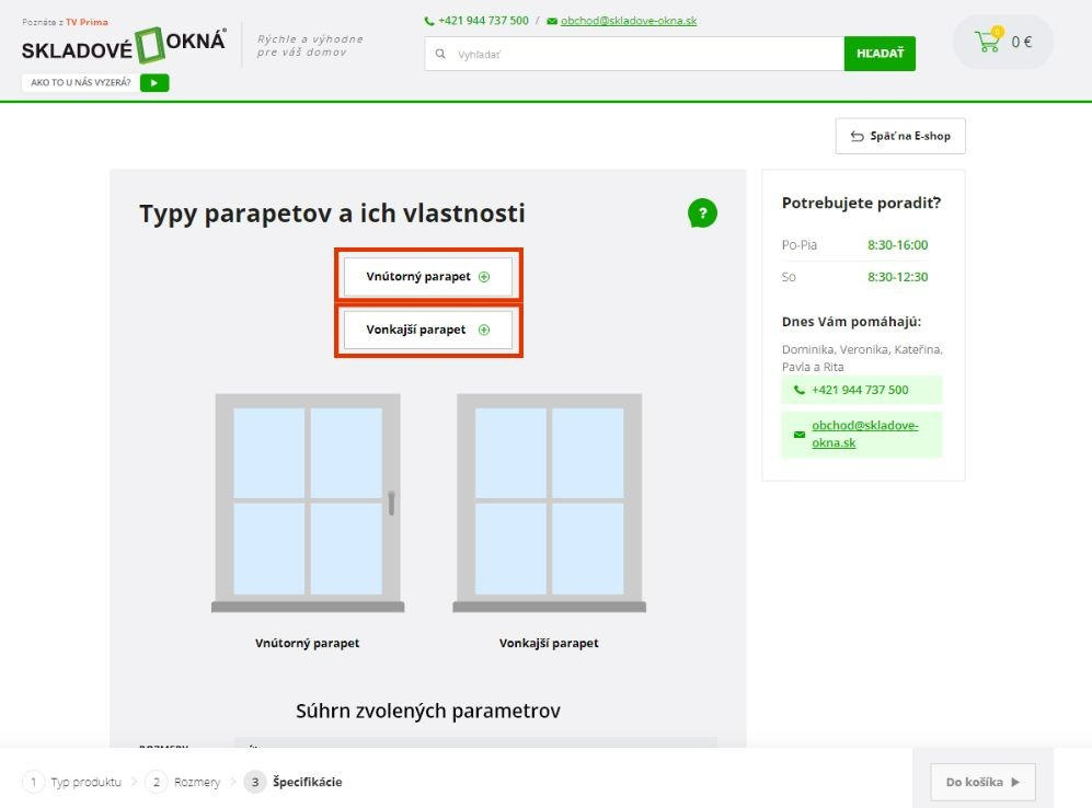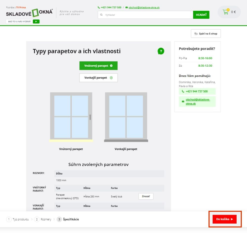 6. Po potvrdení výberu sa objaví súhrn parametrov. Skontrolujte ho a potvrdením pridajte parapety do košíka.