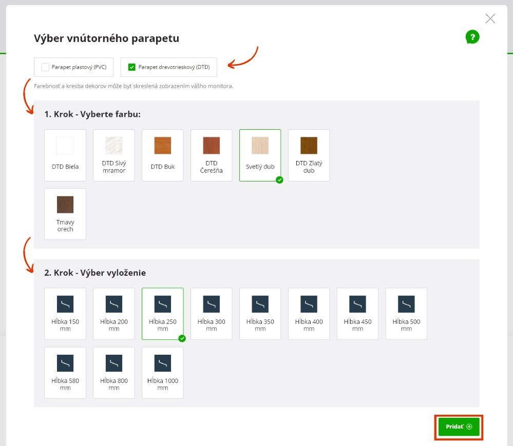 Pri vnútornom aj vonkajšom parapete máte na výber materiál. Pre interiér je k dispozícii plastový (PVC) alebo drevotrieskový (DTD) parapet, pre exteriér hliníkový ohýbaný alebo hliníkový ťahaný. Následne si navolíte farbu a hľbku vyloženia.