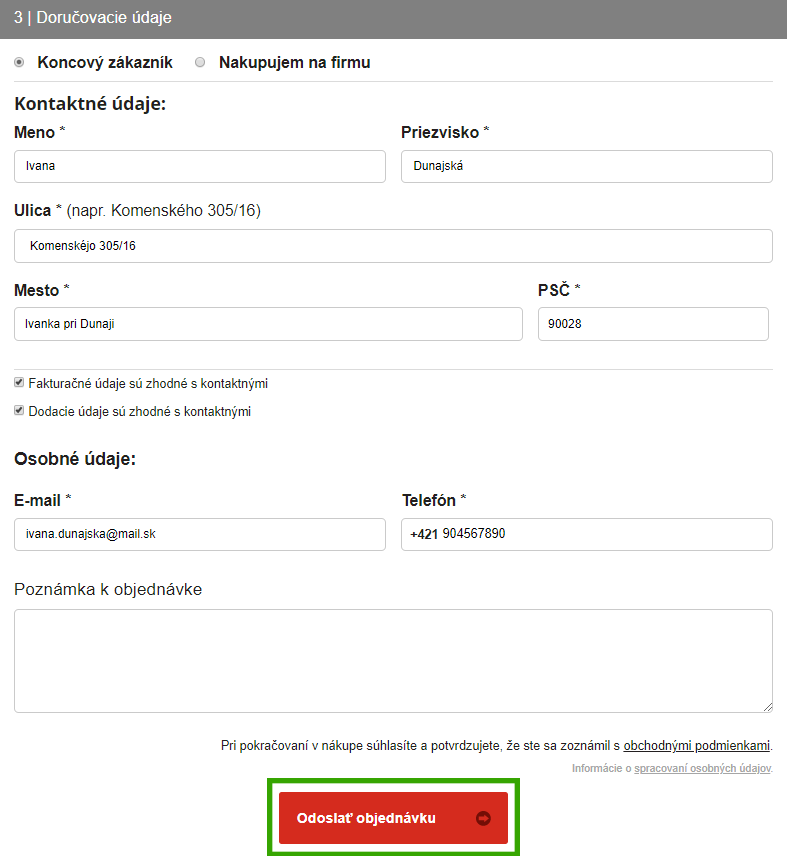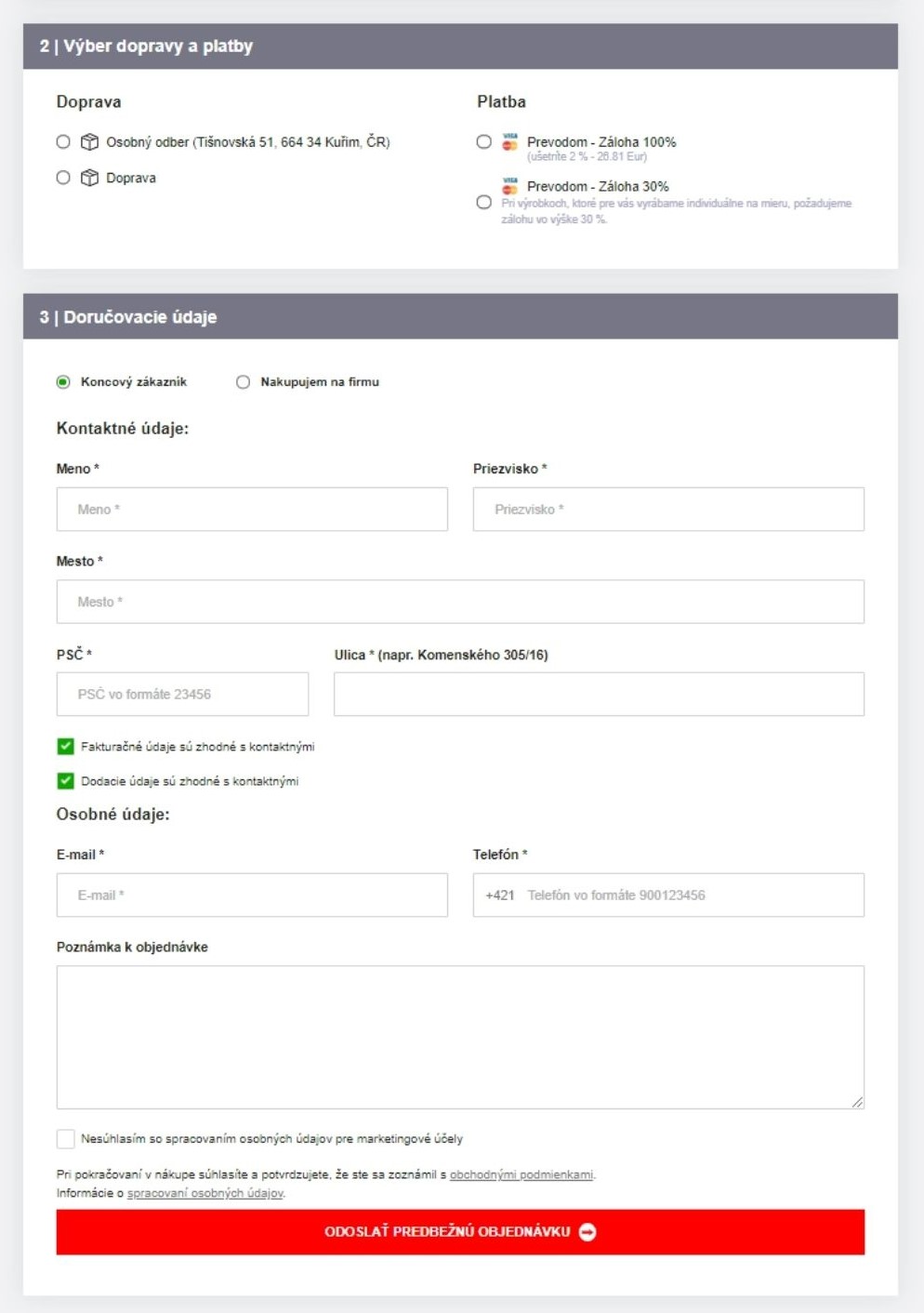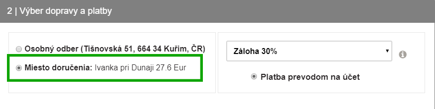 V druhej časti sa dostávame už k samotnému doručeniu. Vyberte si dopravu, ktorá vám vyhovuje – osobný odber v Kuřimi v Českej republike alebo doručenie k vám domov. Po zvolení dopravy ihneď uvidíte cenu za dopravu, takže budete mať prehľad o cene. Potom už iba stačí vypísať svoje doručovacie údaje a odoslať objednávku.