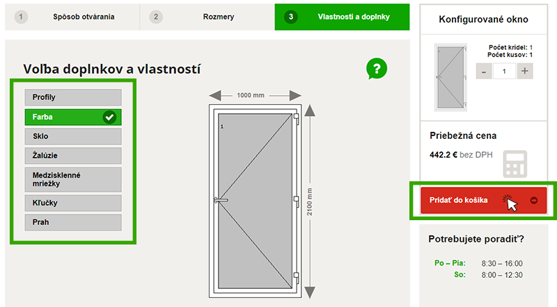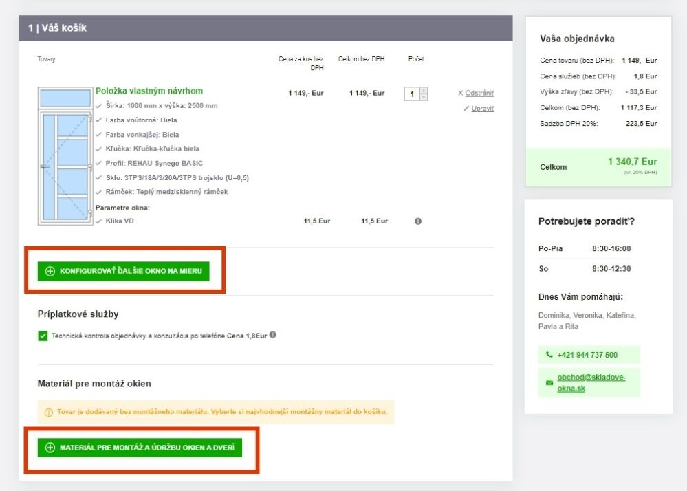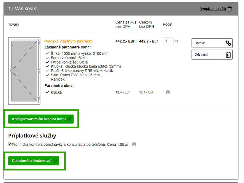 Tu vidíte zhrnutie celej objednávky. V tomto kroku si skontrolujte objednávku a prípadné zmeny môžete upraviť alebo odstrániť. Alebo sa môžete rovno pustiť do konfigurácie ďalších dverí alebo okien pomocou tlačidla „Konfigurovať ďalšie okno na mieru“.Príplatkové služby – Nechajte si skontrolovať a skonzultovať vašu objednávku odborne. Aby ste mali istotu, že ste si zvolili (nakonfigurovali) správny typ okna. Ďalej si v kolónke „Materiál pre montáž a údržbu okien“ môžete vybrať príslušenstvo k montáži alebo k údržbe okien.