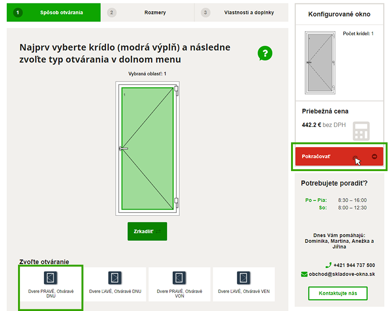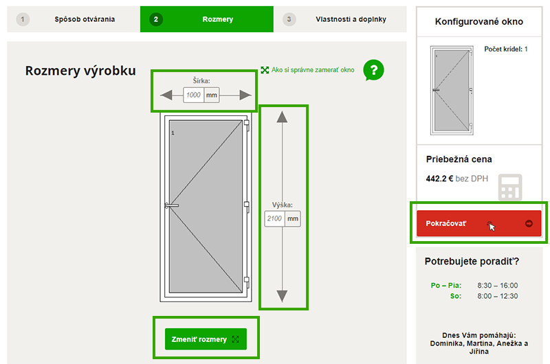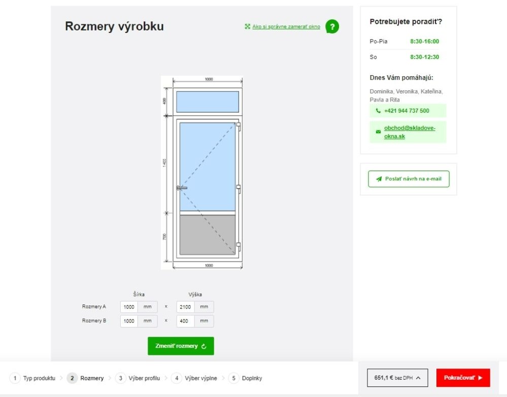 - Rozmery dverí – Zadajte do kolóniek šírka a výška rozmery vašich dverí na mieru a kliknite na „Zmeniť rozmery“. Rozmery a náhľadový obrázok sa aktualizujú. Potom kliknite na červené tlačidlo „Pokračovať“ v pravej časti webu a prejdite k vlastnostiam a doplnkom okna.