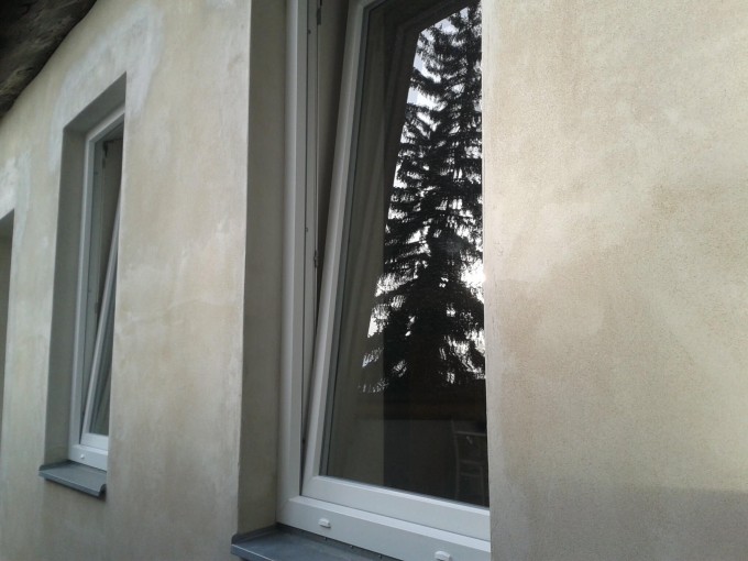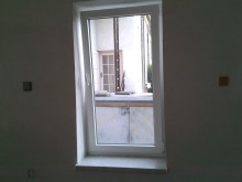 Výplne dverí sú v profilovom systéme REHAU Smartline+ classic s dvojitým zasklením, s kovaním Winkhaus activPilot po obvode. Zákazník si objednal biele sieťky proti hmyzu na okná a vnútorné plastové parapety zo sivého mramoru.