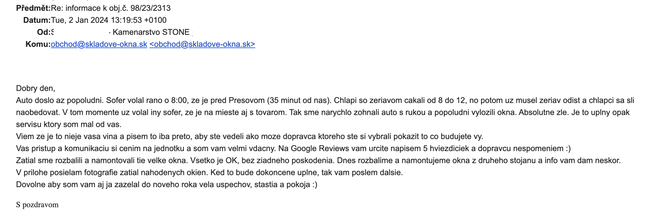Zatím jsme rozbalili a namontovali velká okna. Vše je v pořádku, žádné poškození. Dnes vybalíme a namontujeme okna z druhého regálu a později Vám dám info.