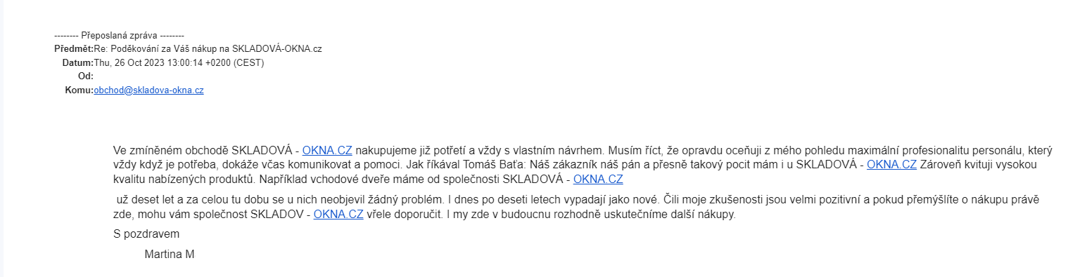 Ve zmíněném obchodě SKLADOVÁ - OKNA.CZ nakupujeme již potřetí a vždy s vlastním návrhem. Musím říct, že opravdu oceňuji z mého pohledu maximální profesionalitu personálu, který vždy když je potřeba, dokáže včas komunikovat a pomoci. Jak říkával Tomáš Baťa: Náš zákazník náš pán a přesně takový pocit mám i u SKLADOVÁ - OKNA.CZ Zároveň kvituji vysokou kvalitu nabízených produktů. Například vchodové dveře máme od společnosti SKLADOVÁ - OKNA.CZ už deset let a za celou tu dobu se u nich neobjevil žádný problém. I dnes po deseti letech vypadají jako nové. Čili moje zkušenosti jsou velmi pozitivní a pokud přemýšlíte o nákupu právě zde, mohu vám společnost SKLADOV - OKNA.CZ vřele doporučit. I my zde v budoucnu rozhodně uskutečníme další nákupy. S pozdravem Martina M.