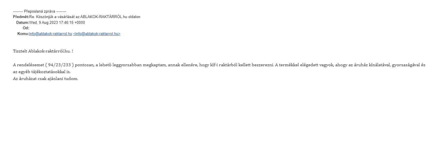 Vážený Ablakok-raktárro.hu. ! Objednávku ( 94/23/233 ) som dostal presne a čo najrýchlejšie, aj keď musela byť zakúpená zo zahraničného skladu. S tovarom som spokojný, aj s ponukou obchodu, rýchlosťou a ďalšími informáciami. Obchod mozem len odporucit. S pozdravom: Mihály Turancsik