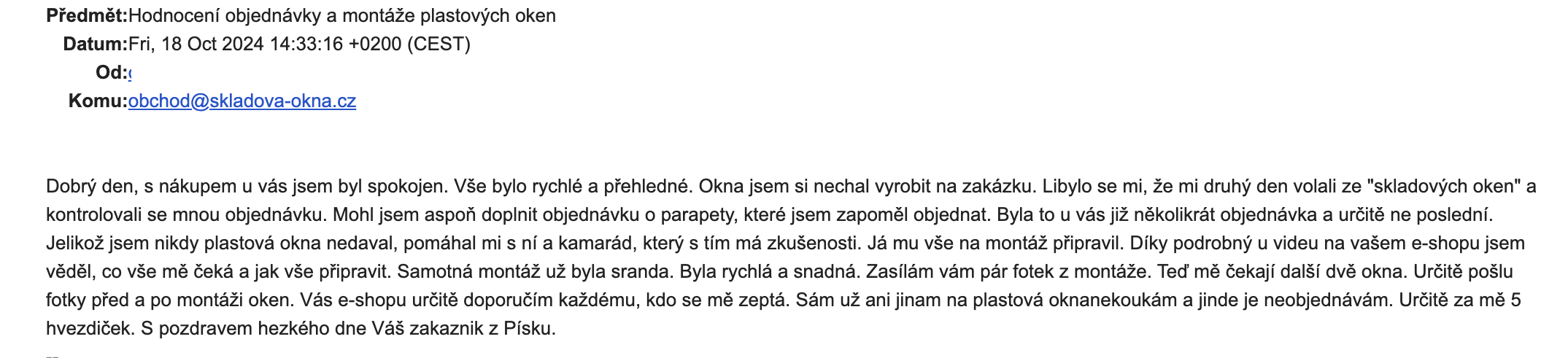 Dobrý deň, bol som spokojný s mojím nákupom od vás. Všetko bolo rýchle a jasné. Okná som si nechal vyrobiť na mieru. Páčilo sa mi, že mi na druhý deň zavolali zo „skladu okien“ a skontrolovali so mnou objednávku. Mohla som objednávku doplniť aspoň o parapety, ktoré som zabudla objednať. Táto objednávka bola u vás už niekoľkokrát a určite nie posledná. Keďže som si nikdy nenechala vkladať plastové okná, pomohol mi kamarát, ktorý s tým má skúsenosti. Pripravil som mu všetko na montáž. Vďaka podrobnému videu na vašom e-shope som vedel, čo všetko ma čaká a ako si všetko pripraviť. Samotná montáž už bola zábava. Bolo to rýchle a jednoduché. Posielam Vám niekoľko fotografií z montáže. Teraz ma čakajú ešte dve okná na montáž. Určite pošlem fotky pred a po montáži okien. Určite vás e-shop odporučím každému, kto ma osloví. Ja sám na plastové okná ani nechodím a inde si ich neobjednávam. Za mňa určite 5 hviezdičiek. S pozdravom, prajem pekný deň Váš zákazník z Písku.