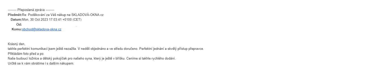Krásný den, takhle perfektní komunikaci jsem ještě nezažila. V neděli objednáno a ve středu doručeno. Perfektní jednání a skvělý přístup přepravce. Přikládám foto před a po.