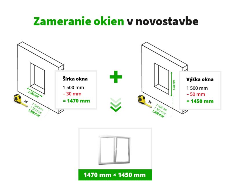 Šírku okna získate tak, že z troch nameraných hodnôt vyberiete tu najmenšiu a z nej odpočítate cca 30 mm. Napríklad keď nameriate hodnoty 1 500 mm, 1 502 mm a 1 503 mm, vyberiete hodnotu 1500, z nej odpočítate 30 mm a objednáte okno o šírke 1470 mm.