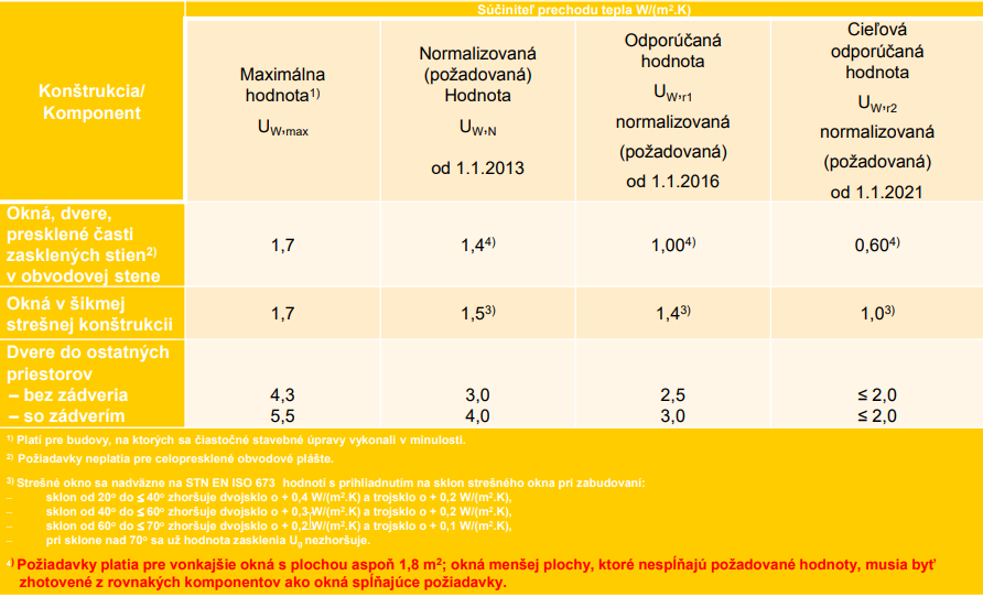 Od 1.1. 2021 budú platné prísne energetické normy na celkovú hospodárnosť novostavieb. Súčasná európska norma sa opiera o súčiniteľ prestupu tepla okna a dverí v obvodovej stene. Ide o hodnotu normalizovanú teda požadovanú 0,85 W/(m².K) a odporúčanú, tzn. 0,65 W/(m².K). A súčasne hodnota prestupu tepla pre obvodovú stenu od 1.1.2021 bude Un = 0,15 W/(m²K).