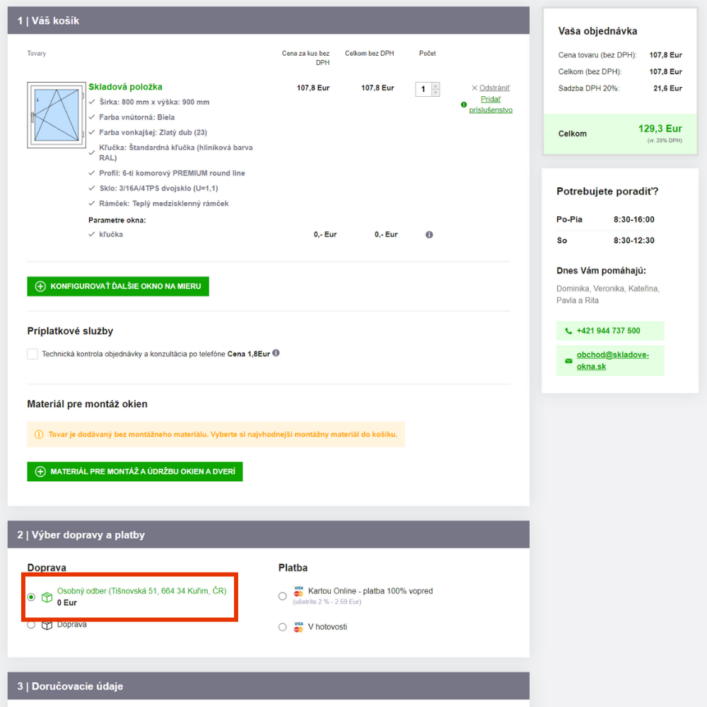 Najlacnejší spôsob doručenia. Okná a dvere, ktoré sú skladom, si môžete vyzdvihnúť v pracovnej dobe ihneď po odoslaní a potvrdení objednávky. Upozorňujeme, že je nutné prísť najneskôr 15 minút pred koncom otváracej doby. Osobný odber je samozrejme bez príplatku.