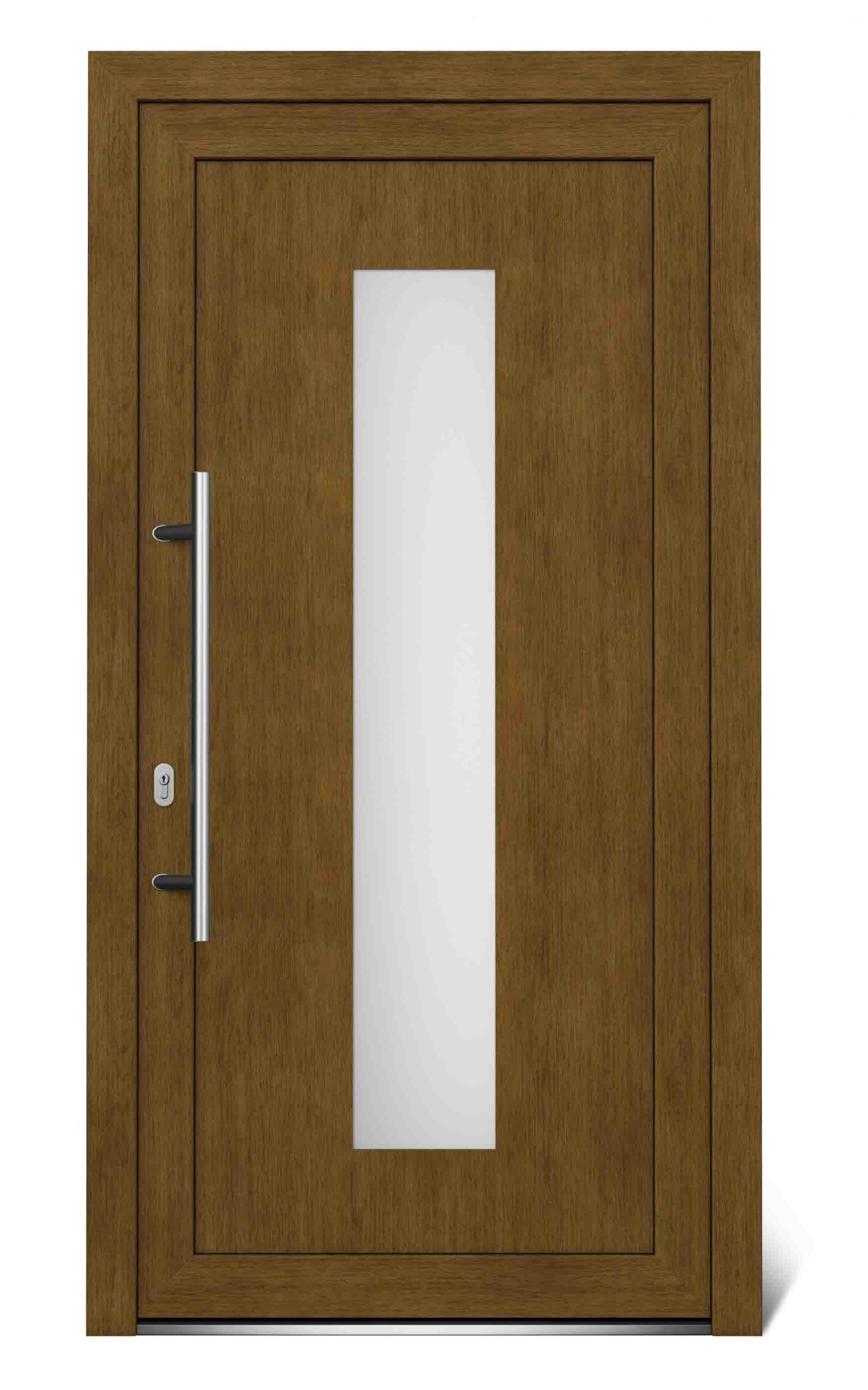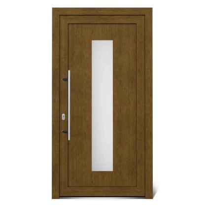 Dvere sú v ľavom prevedení a otvárajú sa dovnútra. Výplň krídla tvorí panel s hrúbkou 36 mm (2 HPL dosky s hrúbkou 2 mm + medzi nimi je 32 mm hrubá polyuretánová pena) a pieskované dvojsklo. Dekoračné fólie sú unikátne pre každý profilový systém a farba alebo dekor sa pri jednotlivých profiloch môže líšiť. Farba fólie zlatý dub pri profilovom systéme ALUPLAST je odlišná od fólie zlatý dub pri profilovom systéme PREMIUM a REHAU.Zobraziť časté otázky