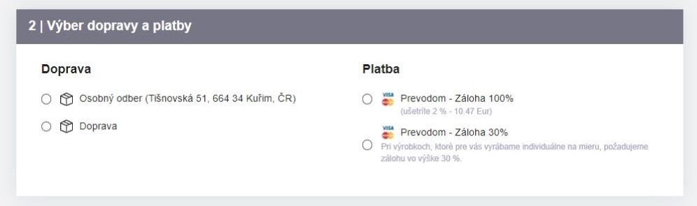 Možnosť platby 100% vopred (pri objednávkach na mieru) – voliteľné