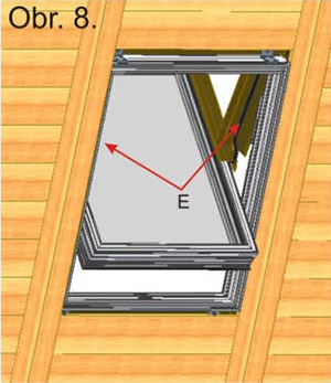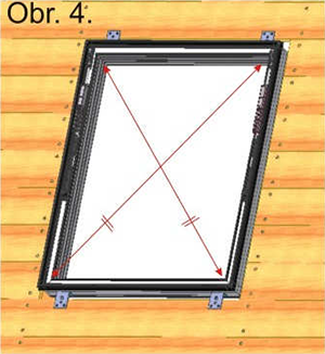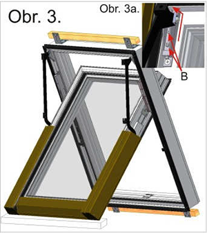 krok 3 ![]() Po odstránení hornej časti oplechovania povoľte zaisťovacie skrutky B a rozpojte kovanie obr. 3a. Toto urobte súčasne na ľavej aj pravej strane. Vyberte opatrne krídlo a položte ho na čistú, mäkkú podložku. Odskrutkujte hornú aj dolnú drevenú transportnú lištu. | krok 4 ![]() Pripravte otvor pre vloženie rámu, obr. 4. Upevnite pomocou skrutiek rám do latovania, vždy po troch skrutkách na jeden montážny uholník. POZOR, je treba dbať na správne vycentrovanie a rozteč uhlopriečok (max. rozdiel 1 mm). |