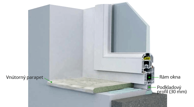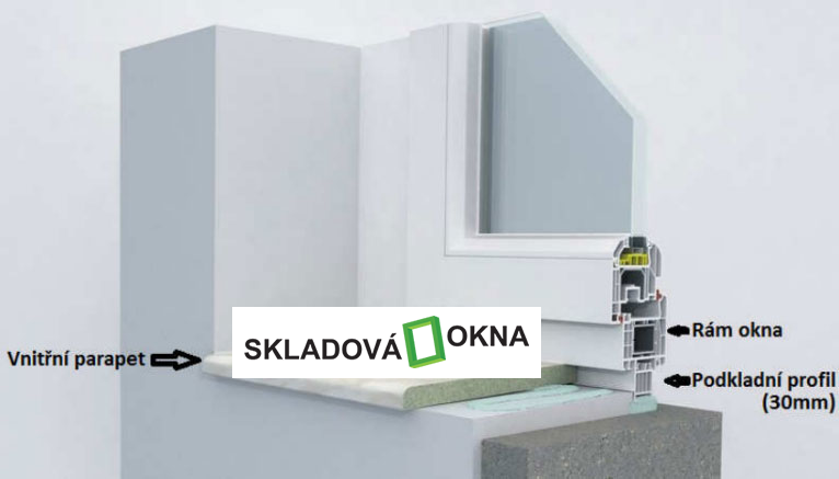 ** Podkladový profil alebo tiež parapetný doraz je profil, ktorý je umiestnený na spodnej strane rámu okna. Najčastejšie meria na výšku 30 mm. K tomuto profilu sa doráža vnútorná parapeta a slúži tiež pre jednoduchú montáž parapety vonkajšej (viď nižšie uvedený obrázok). Pri zadaní okien do výroby je nutné uviesť, že výšku okna uvádzate bez 30 mm podkladového profilu a to z dôvodu, aby bolo jasne dané, či Vami predkladaná výška okna je vrátane podkladového profilu alebo či je jeho výška už odpočítaná.