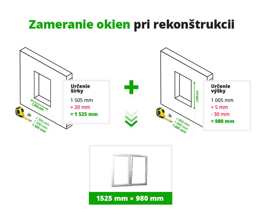 Príklad: Namerali ste tri hodnoty: 1 000 mm, 1 005 mm a 1 000 mm. Vyberiete najväčšie číslo – 1 005 mm, ku ktorému pripočítate 5 mm a odčítate 30 mm. Výsledná výška okna tak bude 980 mm.