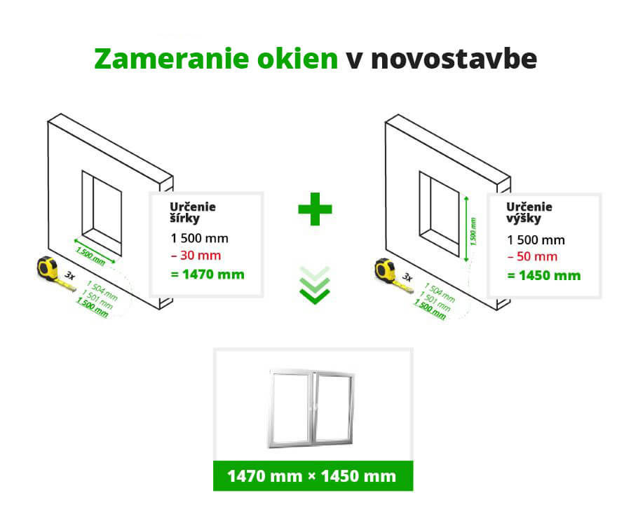 Príklad: Namerali ste tri hodnoty: 1 500 mm, 1 502 mm a 1 503 mm. Vyberiete najmenšie číslo 1 500, z neho odpočítate 30 mm a objednáte okno so šírkou 1 470 mm.