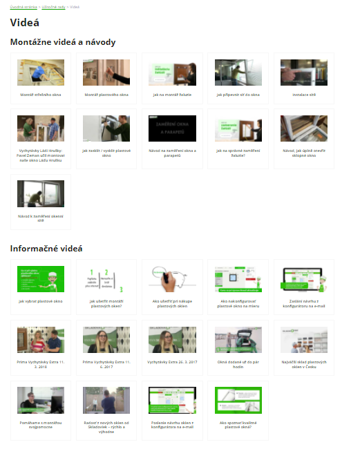 Neustále sa snažíme naše webové stránky zlepšovať, a tak teraz v hornej záložke užitočné tipy nájdete nielen odkaz na časté otázky, poradňu, slovník pojmov a stránku, koľko montáží svojpomocne ušetríte, ale tiež súpis videí, ktoré sme pre vás v uplynulých rokoch natočili.Pre prehľadnosť sú roztriedené na montážne videonávody a informačné videá napríklad o našej firme alebo keď sme boli v televíznych reláciách.