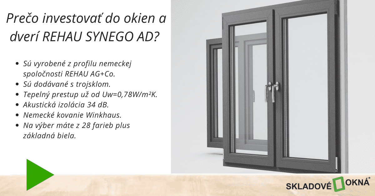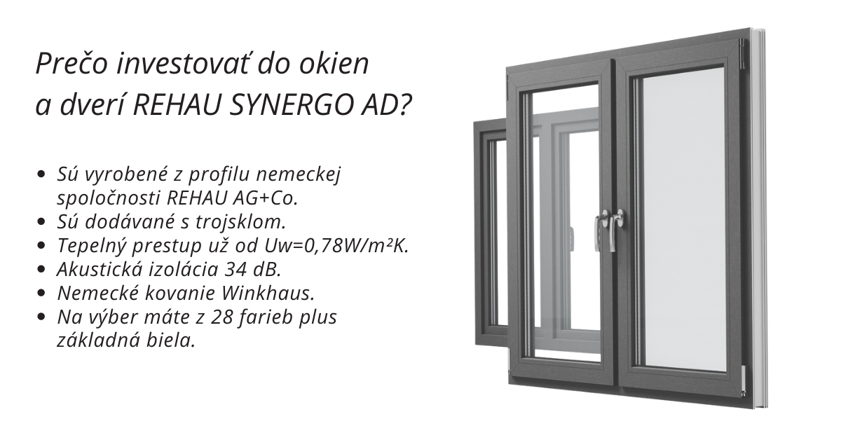 Uvedomujeme si neustále rastúci tlak na úsporu energie, a tak v nadväznosti na dopyt od zákazníkov rozširujeme náš sortiment o nemecký profil REHAU SYNEGO AD. Ten je už v štandarde dodávaný s trojsklom. Vyhovuje i normám pre nízkoenergetické a pasívne domy. Profil REHAU je šesťkomorový a má stavebnú hĺbku 80 mm.Okná a dvere (vchodové hlavné a vedľajšie, sklopno-posuvné) REHAU SYNEGO AD si ľahko zvolíte v našom online konfigurátore. K dispozícii sú dva varianty krídiel: rovné – typ klasik, predsadené zaoblené – typ round line. Rovnako ako pri profile PREMIUM i pre profil REHAU SYNEGO AD platí, že do konca novembra sú okná a dvere automaticky osadené lepším plastovým rámikom, ktorý eliminuje vznik rosenia.