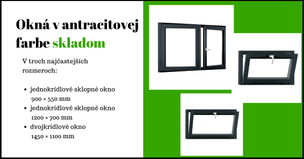 Blíži sa leto a to je i doba, kedy sa ľudia častejšie púšťajú do montáže okien. Preto sme sa rozhodli od júna rozšíriť naše skladové zásoby a v sortimente lacných skladových okien budú po novom okná i v antracitovej farbe a to v troch najčastejších rozmeroch – jednokrídlové sklopné okno 900 × 550 mm, jednokrídlové sklopné okno 1200 × 700 mm a dvojkrídlové okno 1450 × 1100 mm.Ak tiež plánujete mať nové okná v trendy tmavo šedom sfarbení, ale potrebujete iný rozmer, využite náš konfigurátor. Na ňom si môžete zvoliť i lepšie izolačné trojsklá alebo ornamentné zasklenie.