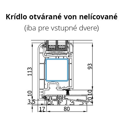 - Celková priepustnosť Uw od 0,82 W/m²K (vzorové hodnoty pre aktuálnu konfiguráciu profilového balíka, skla, dištančných rámov alebo výplne dverí pri výpočte jednokrídlových dverí 1,10 m × 2,20 m).