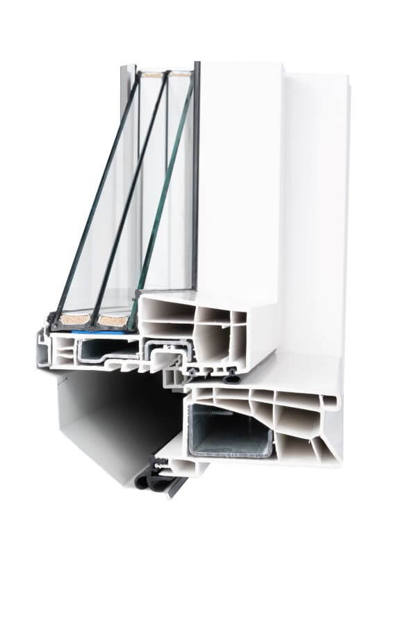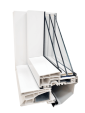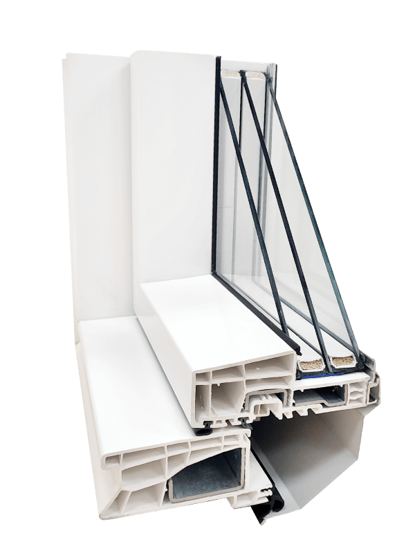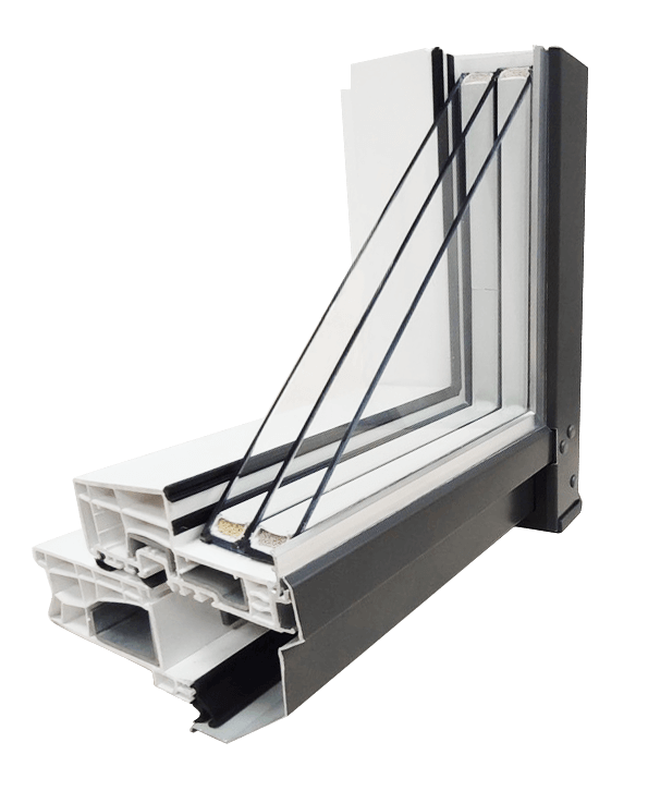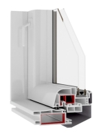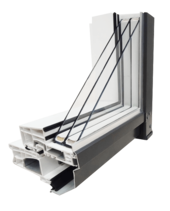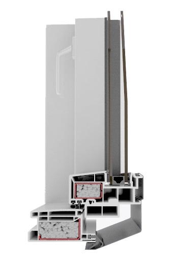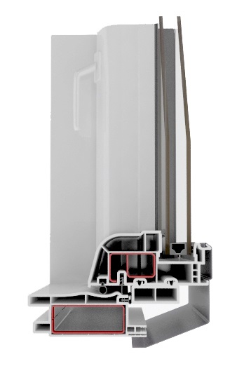 - Hranatý viackomorový profil (3 komory v ráme, 5 komôr v krídle) s oceľovými výstuhami, vnútri je strieborná zasklievacia lišta.