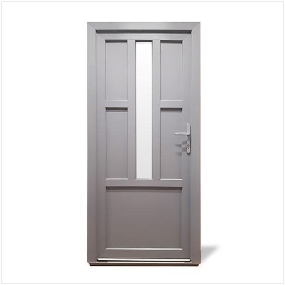 - Vedľajšie vchodové dvere REHAU SYNEGO AD v šedej farbe so štruktúrou dreva, ktoré majú päť plných polí a jeden presklený pruh s čírym sklom.