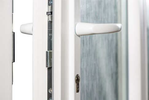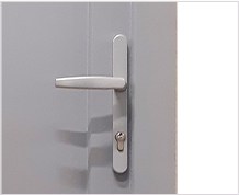 Vedľajšie plastové dvere majú celoobvodové kovanie od nemeckého výrobcu Winkhaus (rad easyLock). Ide o viacbodový zámok s 2 excentrickými valčekmi a 2 hríbovými čapmi, ktoré zaisťujú správny tlak krídla proti rámu po celej jeho výške a tiež tesnosť dverí. Zámok je aktivovaný pomocou kľučky.